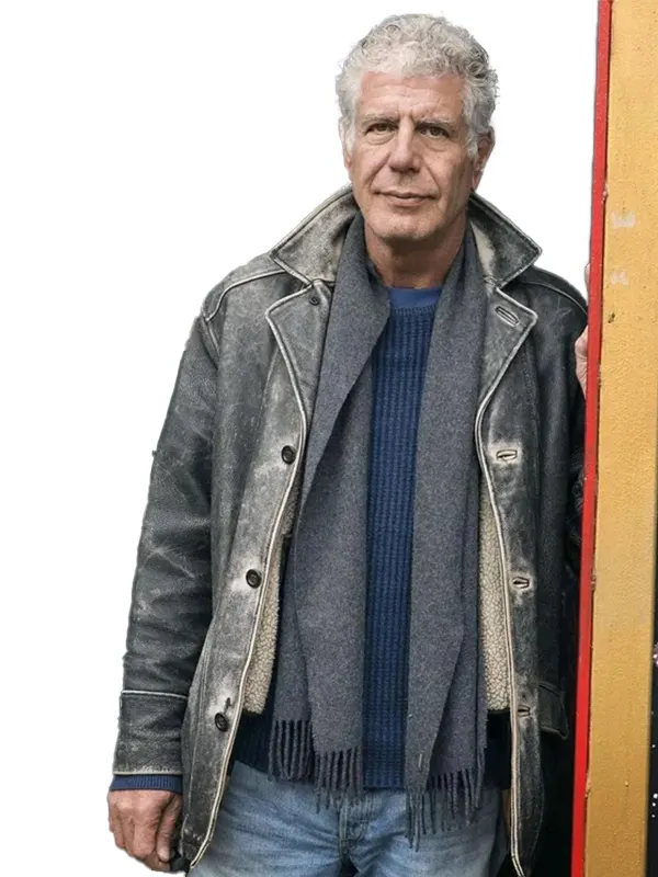 Close-up of Anthony Bourdain Leather Jacket showing the distressed leather texture and button-front style.