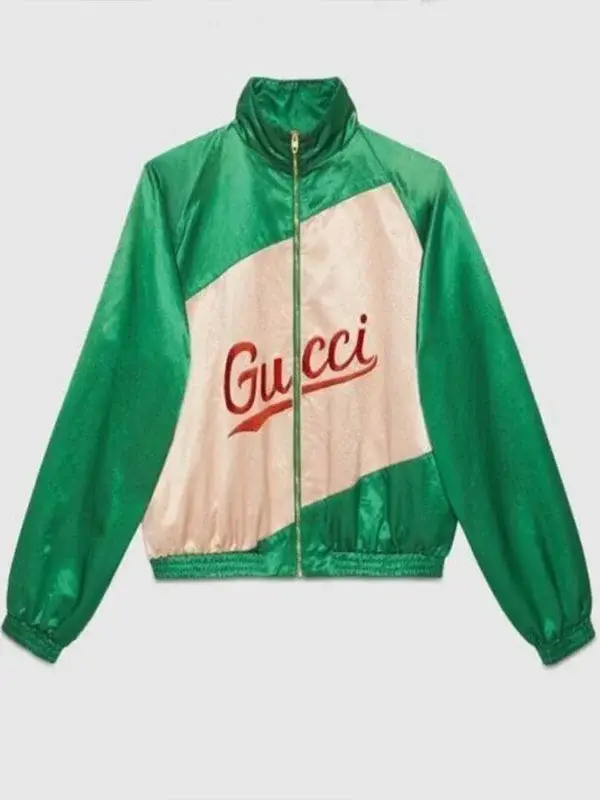 BTS Jimin Gucci Jacket in green satin with contrast detailing and a smart casual bomber jacket design.