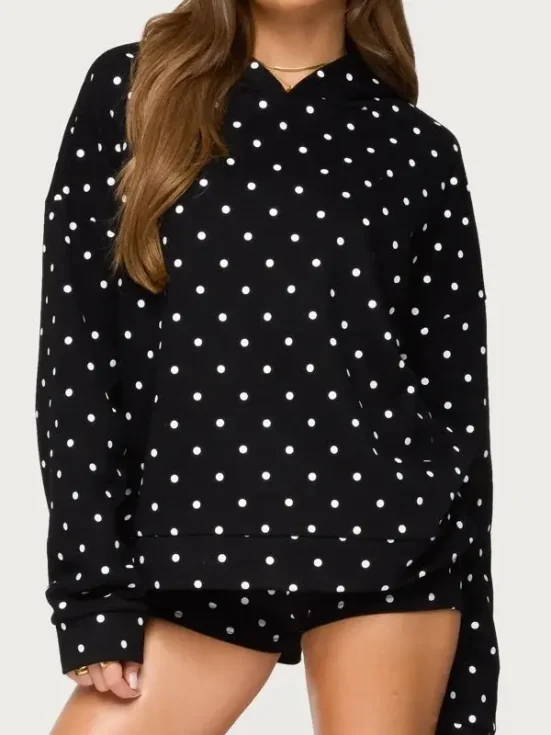 This hoodie is designed with a focus on the popular “oversized” look that defines current 2026 fashion. Made from a premium fleece, it feels incredibly soft against the skin and provides reliable warmth without being too bulky. The drop-shoulder design and roomy hood give it a relaxed, slouchy silhouette that pairs perfectly with baggy jeans, leggings, or the matching spotted loungewear sets. The sharp contrast of the white dots against the black fabric makes it a versatile piece that stands out in any crowd.