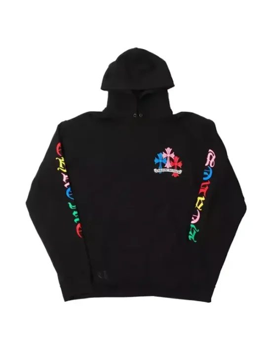 Front view of a chrome hearts rainbow hoodie with vibrant multi color cross logos on a black base.