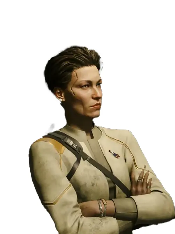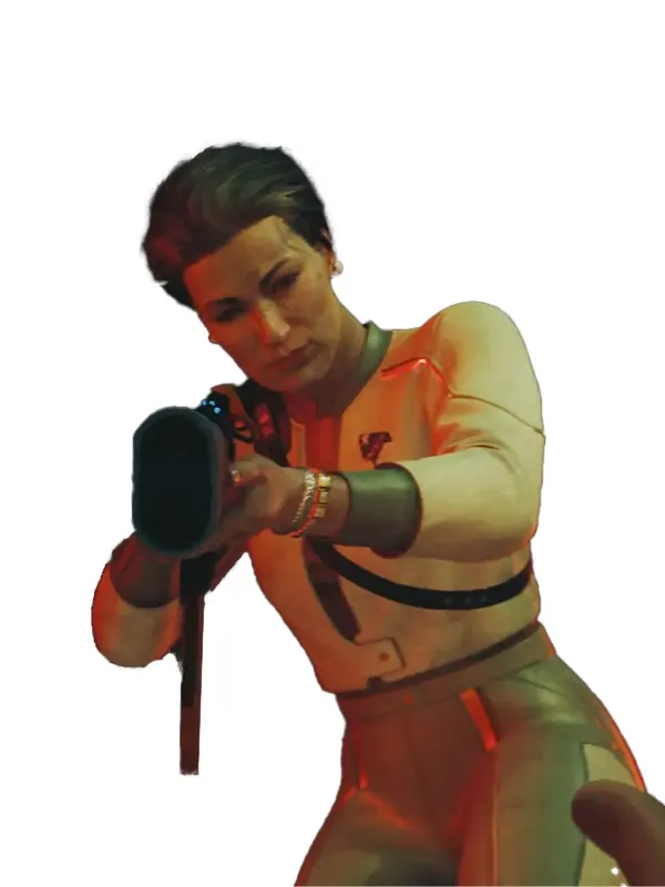 Song So Mi aims a rifle while wearing the white and gold Phantom Liberty bomber jacket. This is a tactical piece of the Cyberpunk V Phantom Liberty outfit