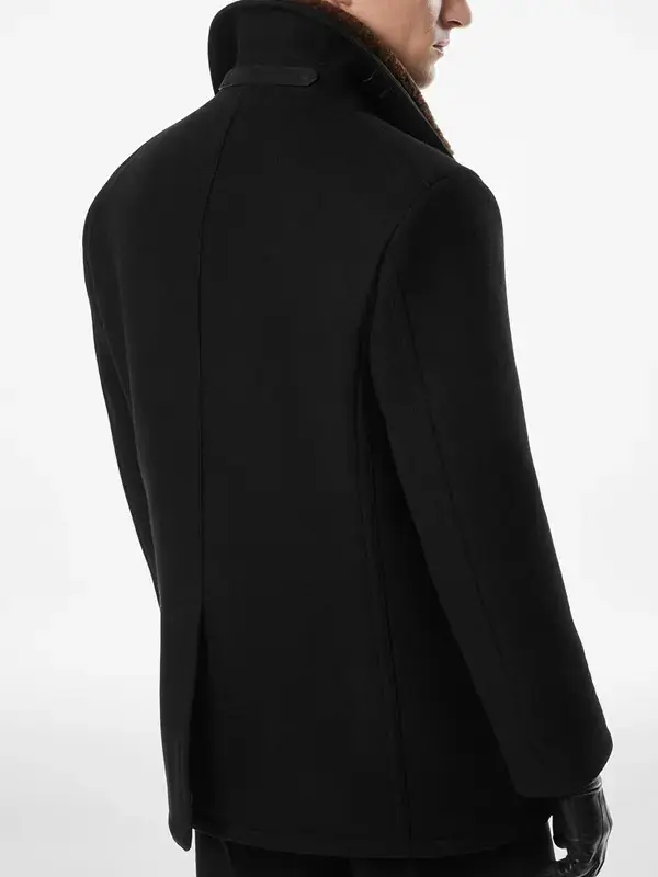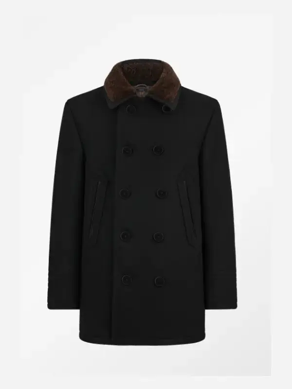 Made from premium wool fabric, this black peacoat feels warm, soft, and strong enough for cold days. The inner shearling lining gives smooth comfort and makes winter layering easy. The structured silhouette, lapel collar, and clean double-breasted style make it look sharp without trying too hard. This is the type of designer winter coat seen in celebrity interview wardrobes and media event fashion because it looks good on camera and even better in person.