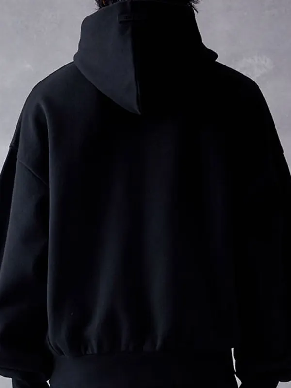 Front view of the Essentials Jet Black Hoodie featuring a clean kangaroo pocket.