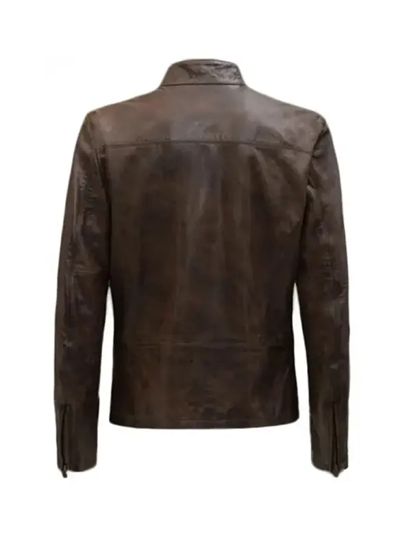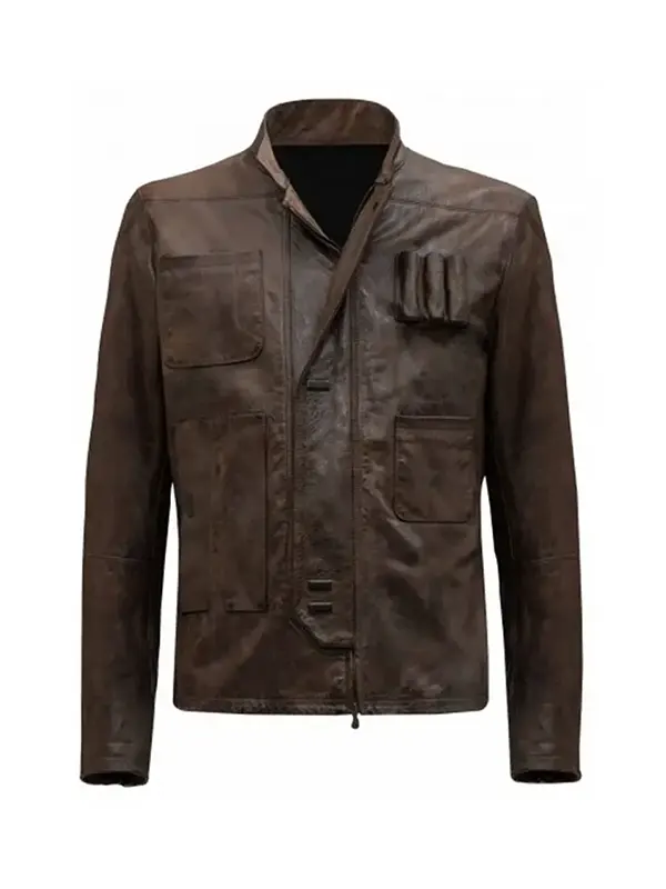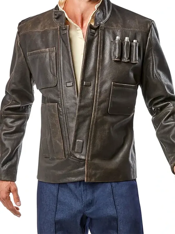A men’s dark brown leather-style jacket with a stand-up collar and chest pockets, inspired by Han Solo.