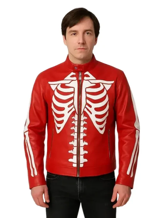 Forged from hand-selected, premium red lambskin, this jacket features industrial-grade bone embroidery that is raised for a three-dimensional, textured finish. The high-contrast white “bones” provide an elite visual edge that stays crisp over time. While this piece captures an aggressive street vibe, you can compare its rugged build with our Born To Rule Red Biker Jacket, or explore the versatile Men’s Black Red Hood Leather Jacket within our broader Men’s Leather Jackets collection.