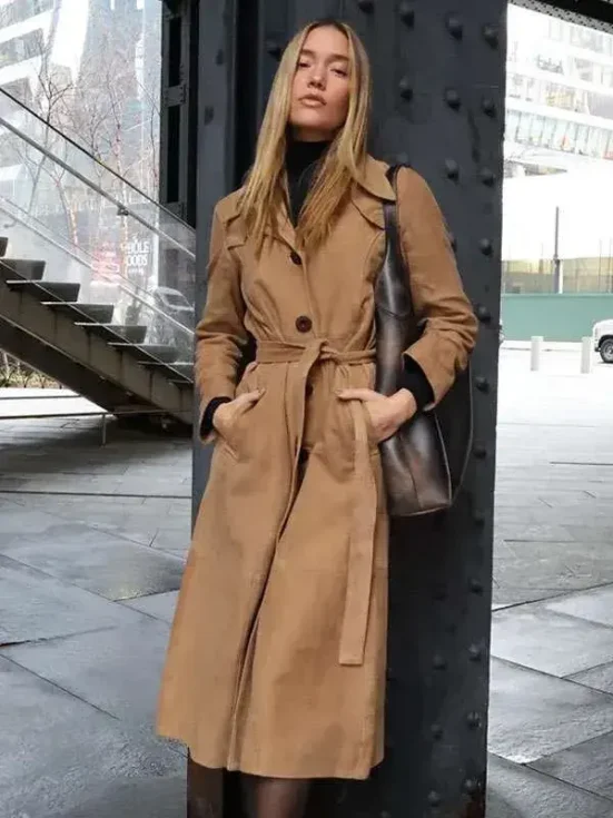 Shop the NYC 2026 Olivia Ponton Brown Suede Leather Trench Coat now and explore more styles in our Leather Coat Collection to find your next statement layer.