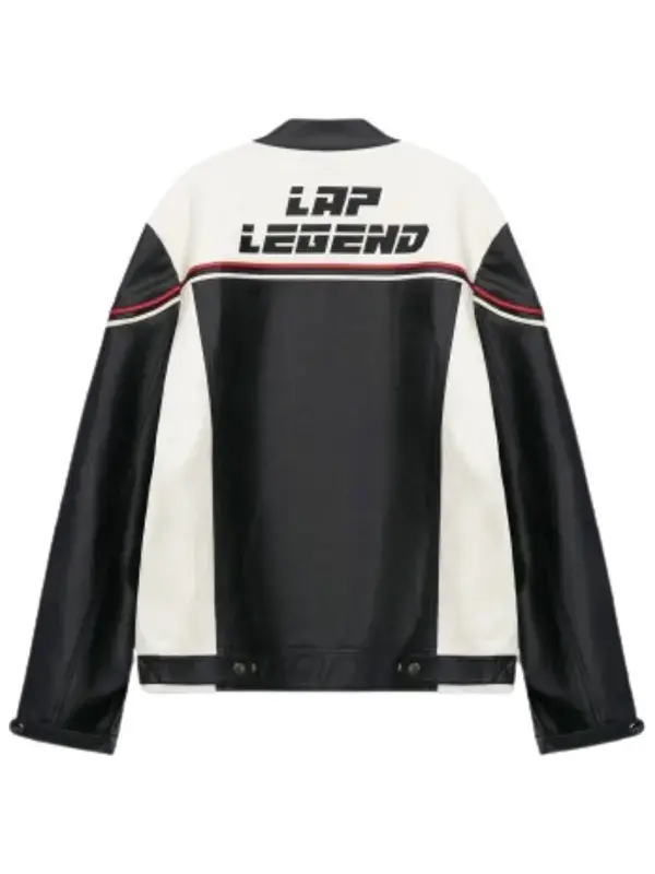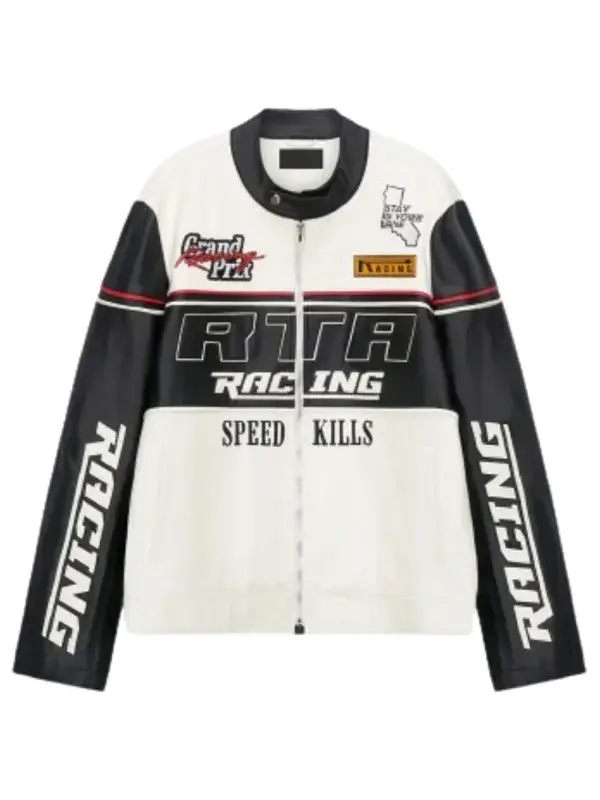 A white and black leather racing jacket with a black chest band, "RTA RACING" logo, and "SPEED KILLS" text centered on the lower white panel.