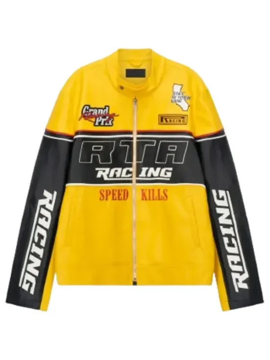 A yellow and black leather racing jacket with a black chest band featuring "RTA RACING." It includes "Grand Prix" patches and red "SPEED KILLS" text.