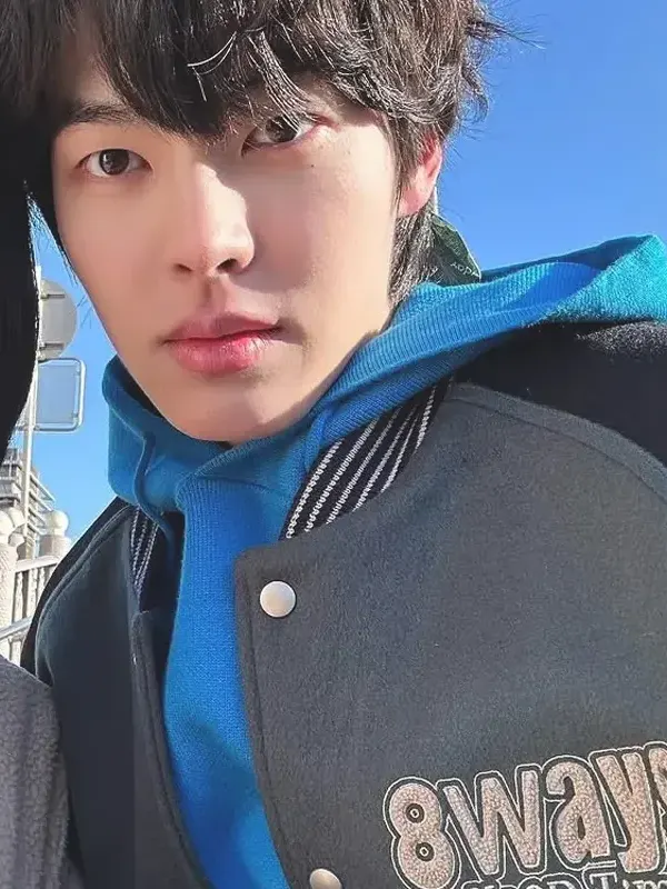 Full view of Study Group Lee Hyeon-woo varsity jacket showing classic varsity style and relaxed streetwear fit
