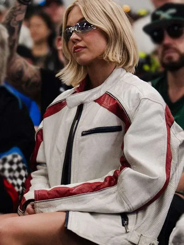 The Sydney Sweeney White Jacket is inspired by her standout look from the NASCAR Championship. Sydney Sweeney is known for fashion that feels bold, fresh, and easy to notice, and this white biker jacket follows that same clean celebrity style.