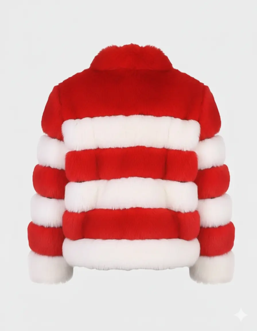 Front view of womens red and white fox fur jacket showing fluffy texture and bold winter style.